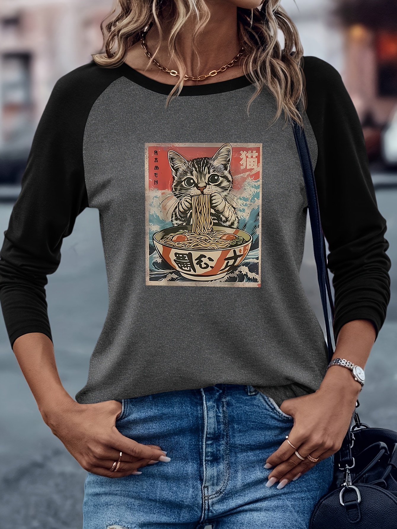 Women's Retro Anime Cat Eating Ramen Graphic Raglan Long Sleeve T-Shirt - Color Block Casual Top with Japanese-Inspired Design, Soft Stretch Fabric, Machine Washable for Spring/Fall, Spring Fall Apparel, Playful Design, Comfortable Fit