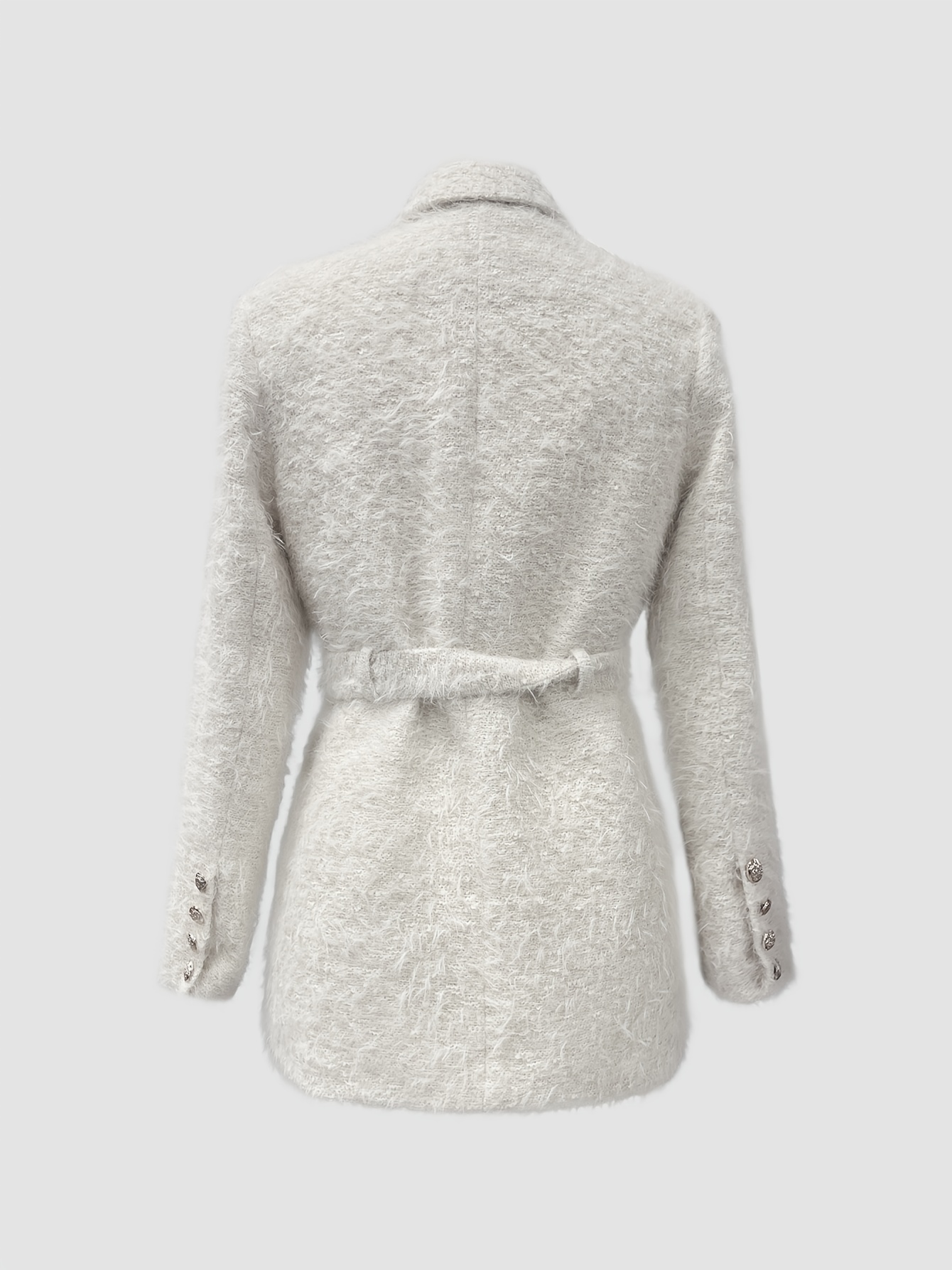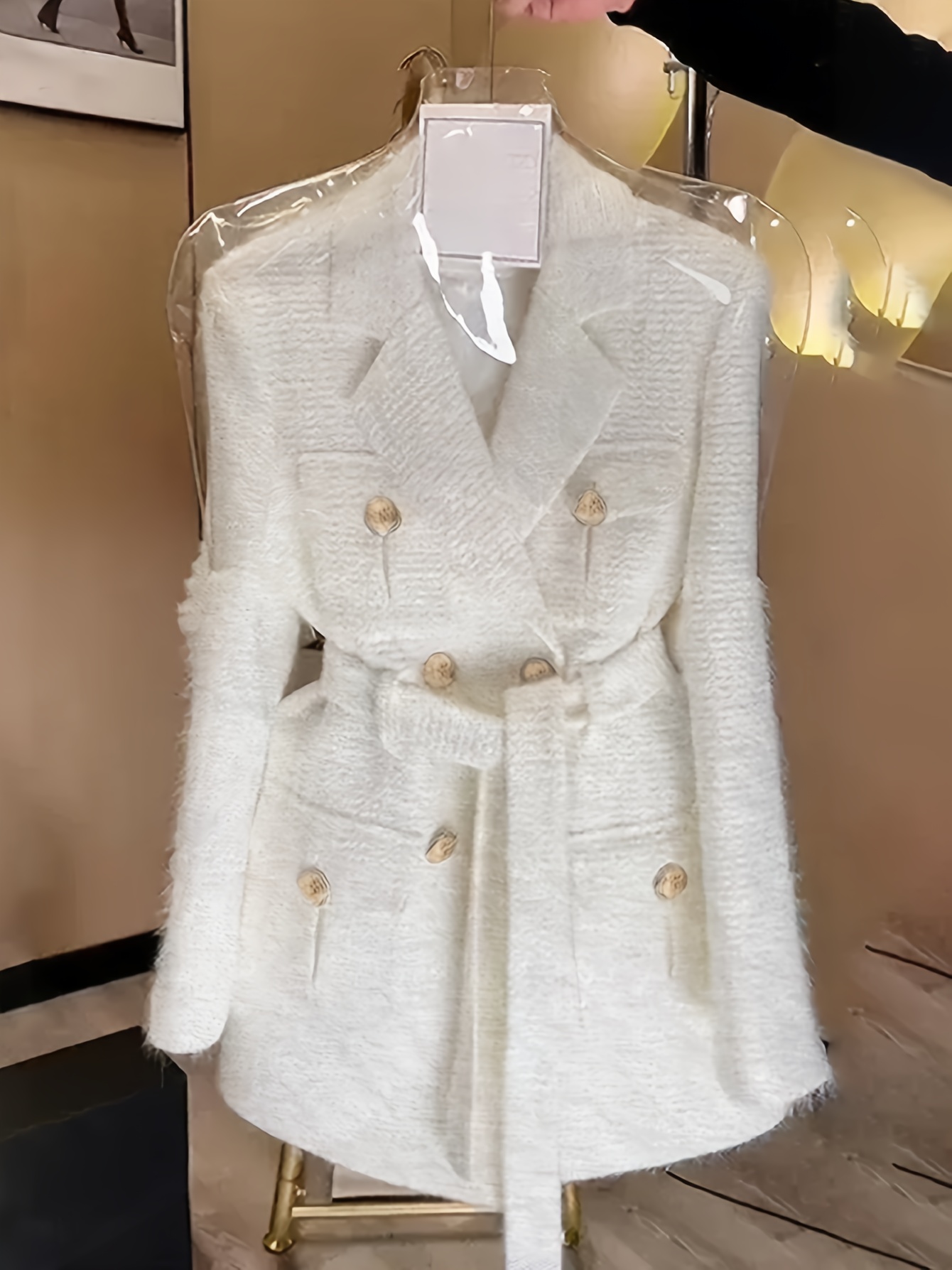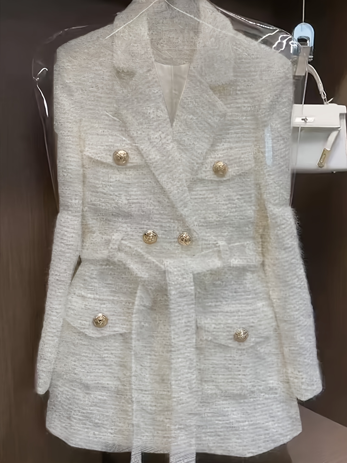 [Elegant Coat] Long Sleeve Elegant Belted Coat | Structured H-Silhouette Jacket with Golden-Tone Buttons & Fur-Lined Cuffs, Machine Washable Solid Color Outerwear for Spring/Fall