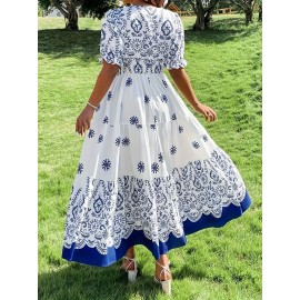 Plus Size, Women's Floral Print maxi Dress - Elegant V-Neck Long Formal & Casual Dresses, Non-Stretchy Fabric, Machine Washable for Wedding, Party, Everyday Outfits - Plus Size Friendly, Cute Dresses