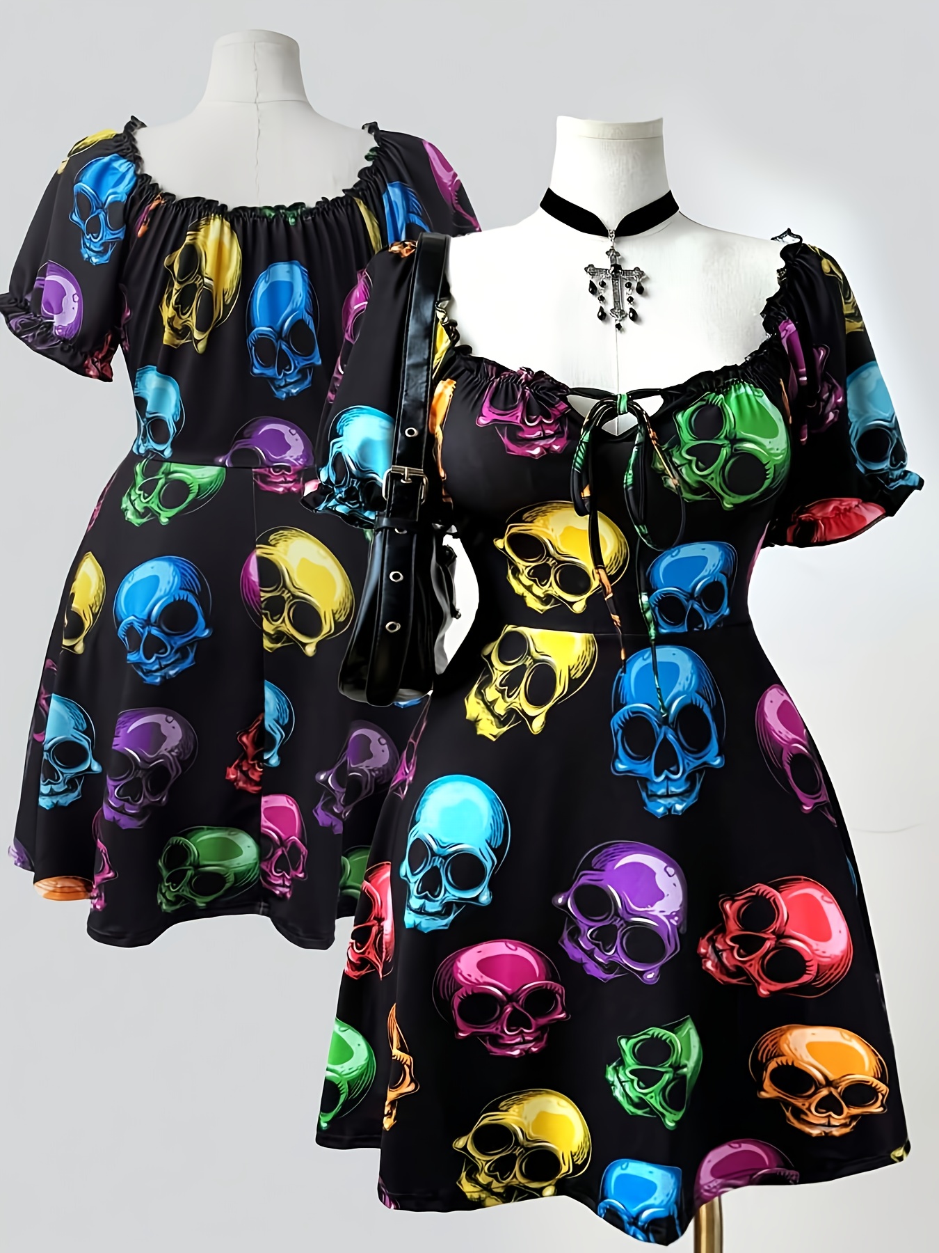 Plus Size - Plus Size, Women'S Plus Size Halloween Party Dress - Gothic Skull Print in Black, Blue, Green, Pink, Orange, Purple - Flared Hem Formal & Costume Party Outfit - Elegant Halloween Party Attire for Women, Festive Wear, Round Neckline