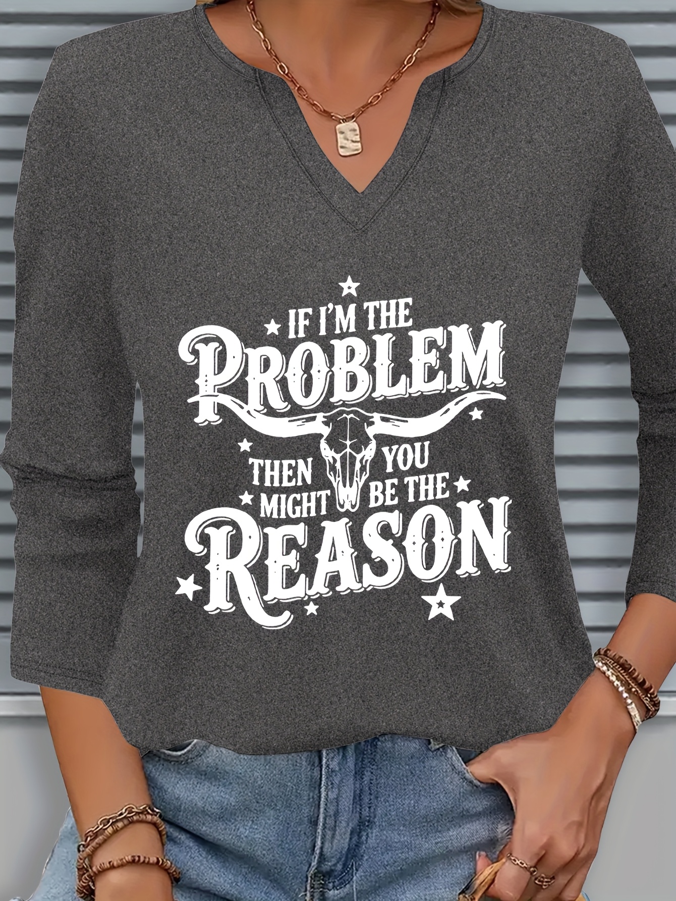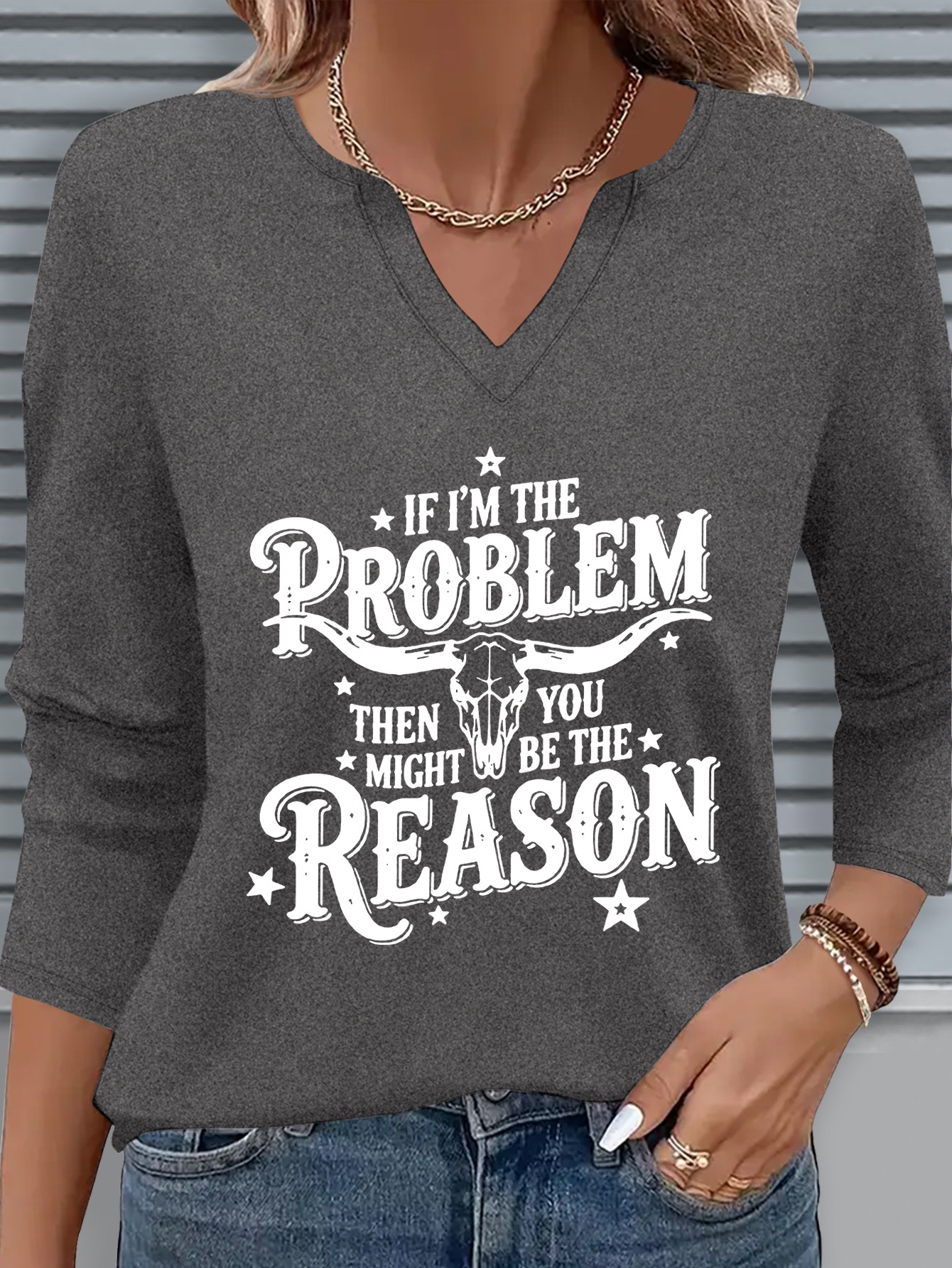 [Casual V-Neck T-Shirt] Comfortable Women's Casual V-Neck 3/4 Sleeve T-Shirt | "If I'm the Problem You Might Be the Reason" Letter Print, Machine Washable Fabric, Perfect for Spring & Summer Everyday Wear, Ladies T Shirt