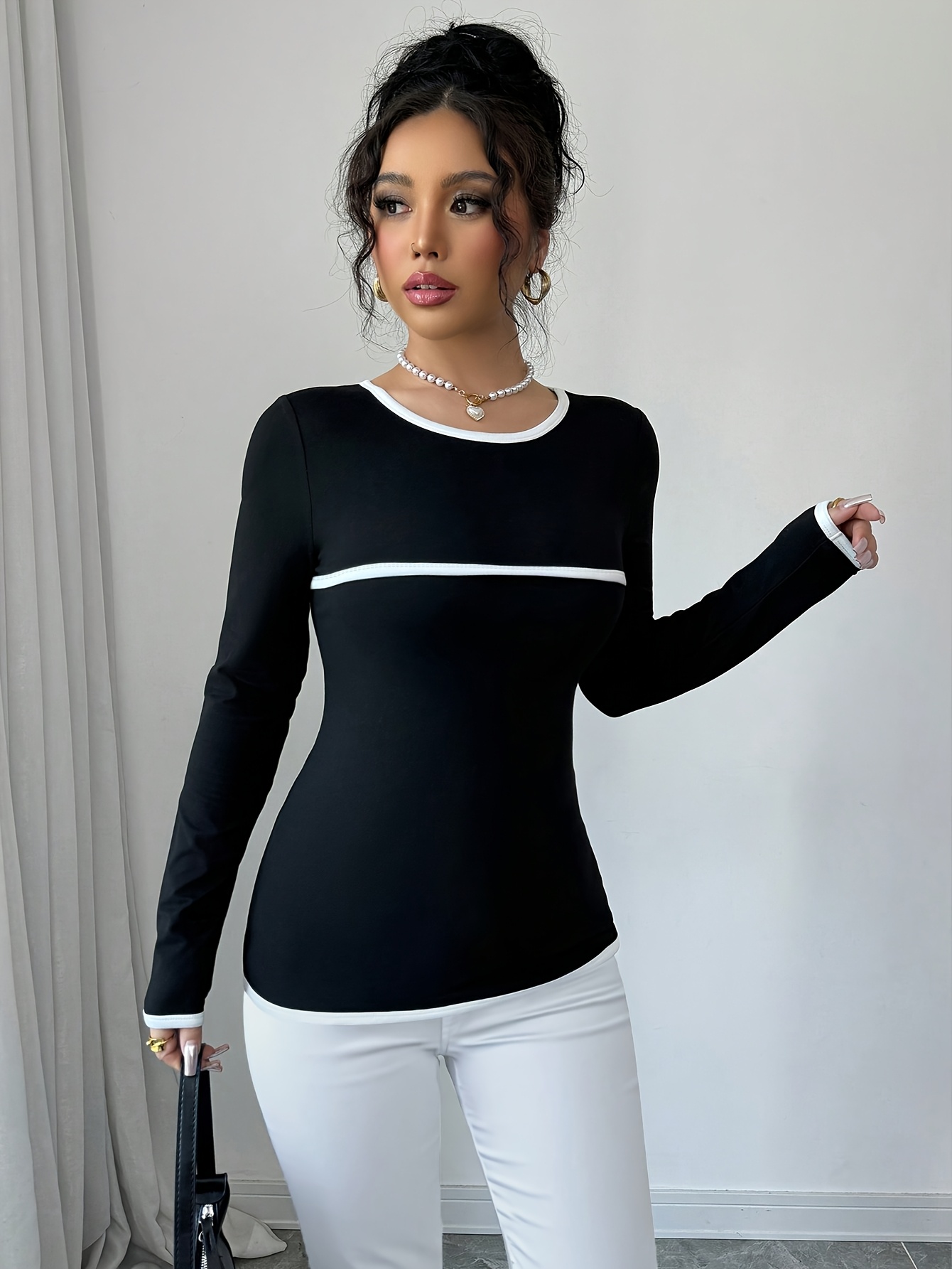 Women'S Elegant Casual Long Sleeve T-Shirt - Slim Fit, Round Neck, Solid Black with White Striped Detail, Stretchy Polyester Blend, Machine Washable, All-Season Comfort