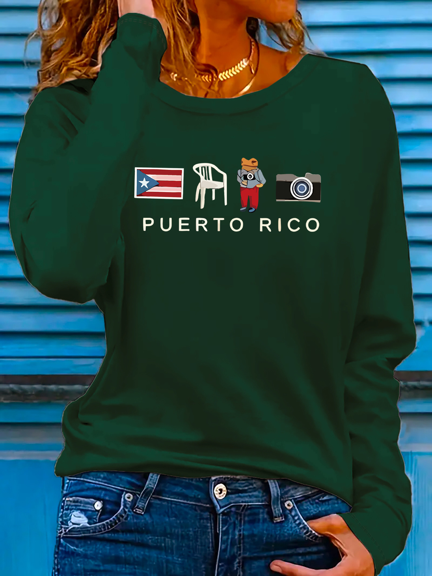 [Stretchy Puerto Rico T-Shirt] Stretchy Polyester Women's Puerto Rico Flag Cartoon Frog Graphic Long Sleeve T-Shirt | Casual Round Neck Top for Spring & Summer Vacation, Machine Washable, Playful Design