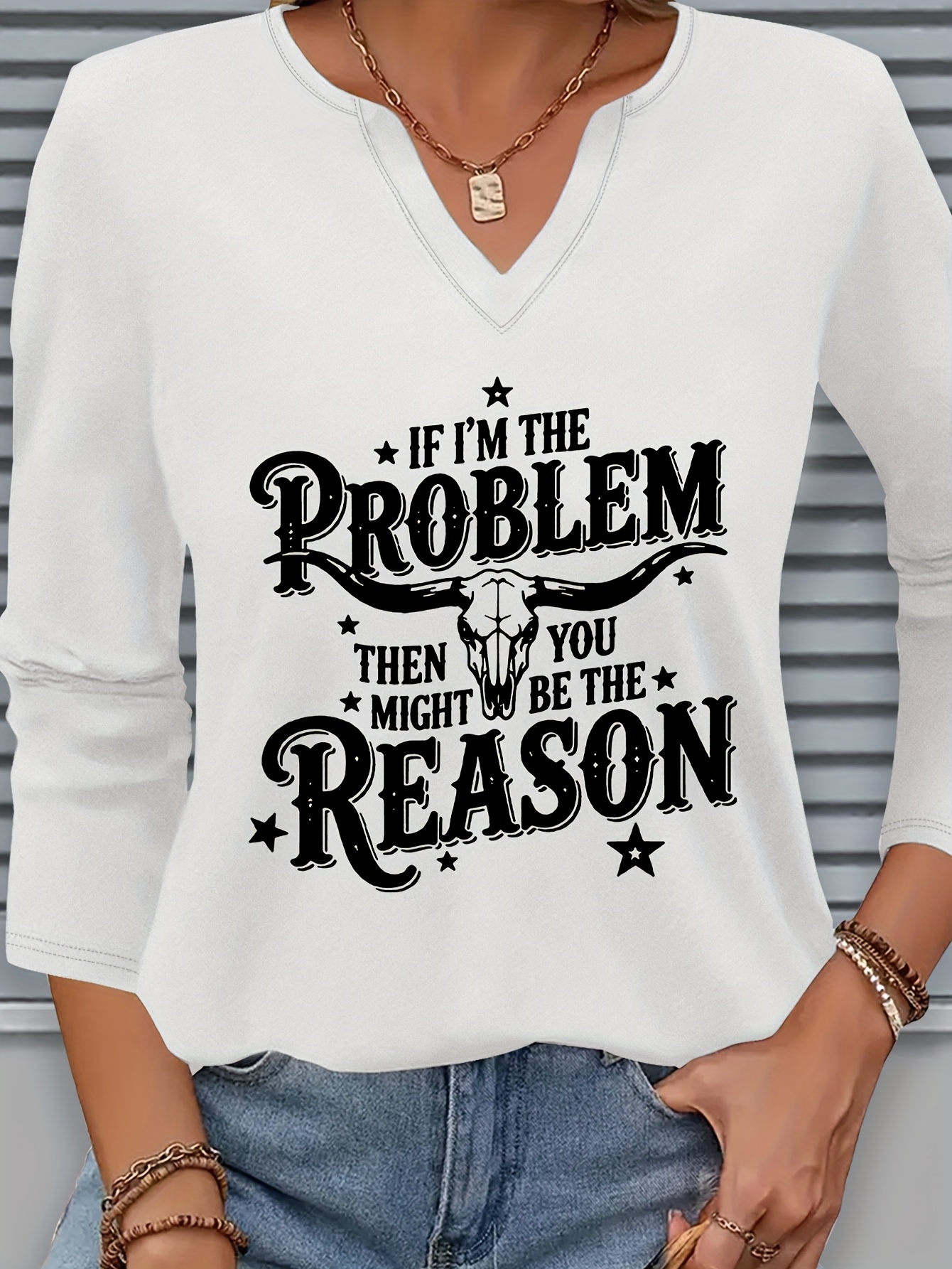 [Casual V-Neck T-Shirt] Comfortable Women's Casual V-Neck 3/4 Sleeve T-Shirt | "If I'm the Problem You Might Be the Reason" Letter Print, Machine Washable Fabric, Perfect for Spring & Summer Everyday Wear, Ladies T Shirt