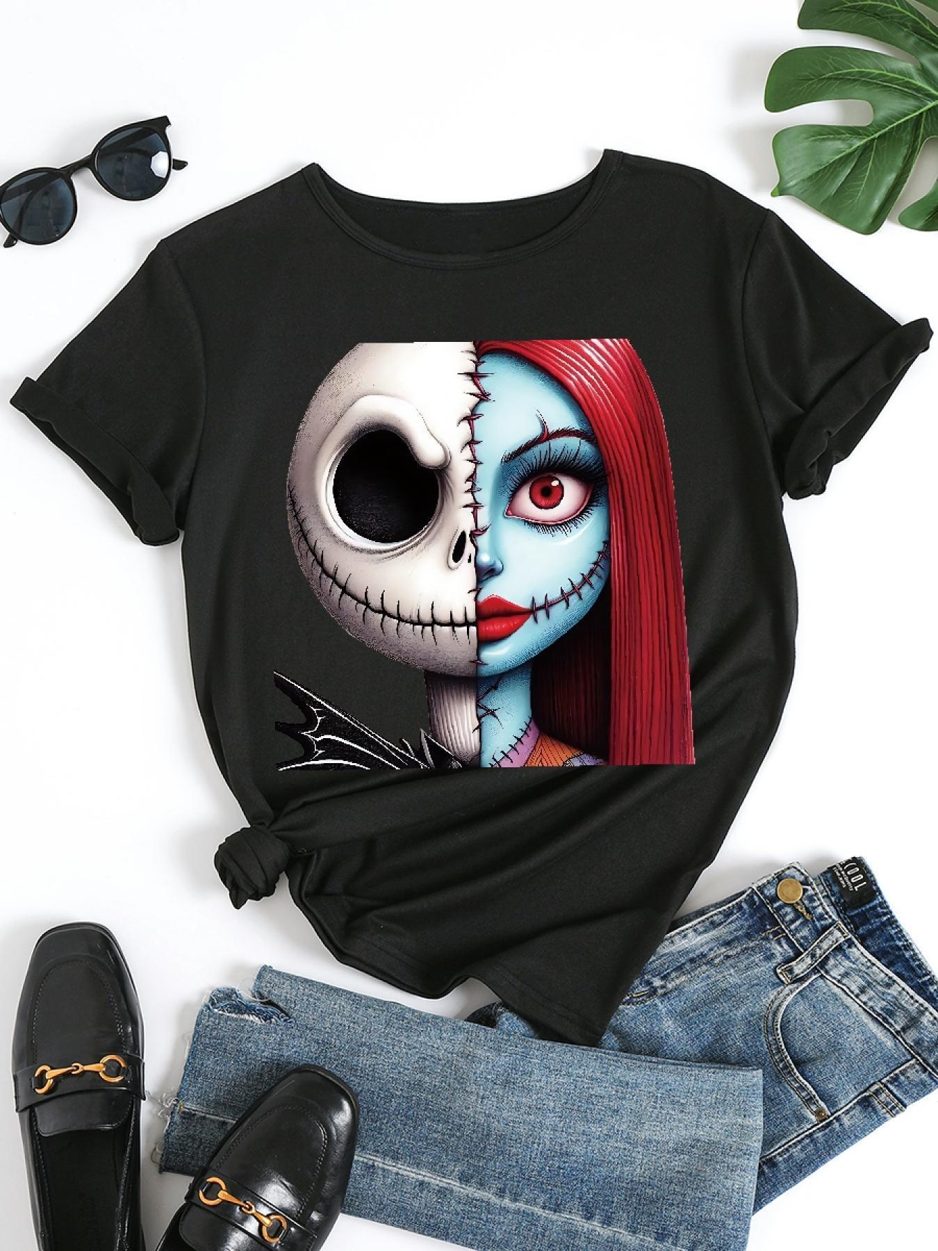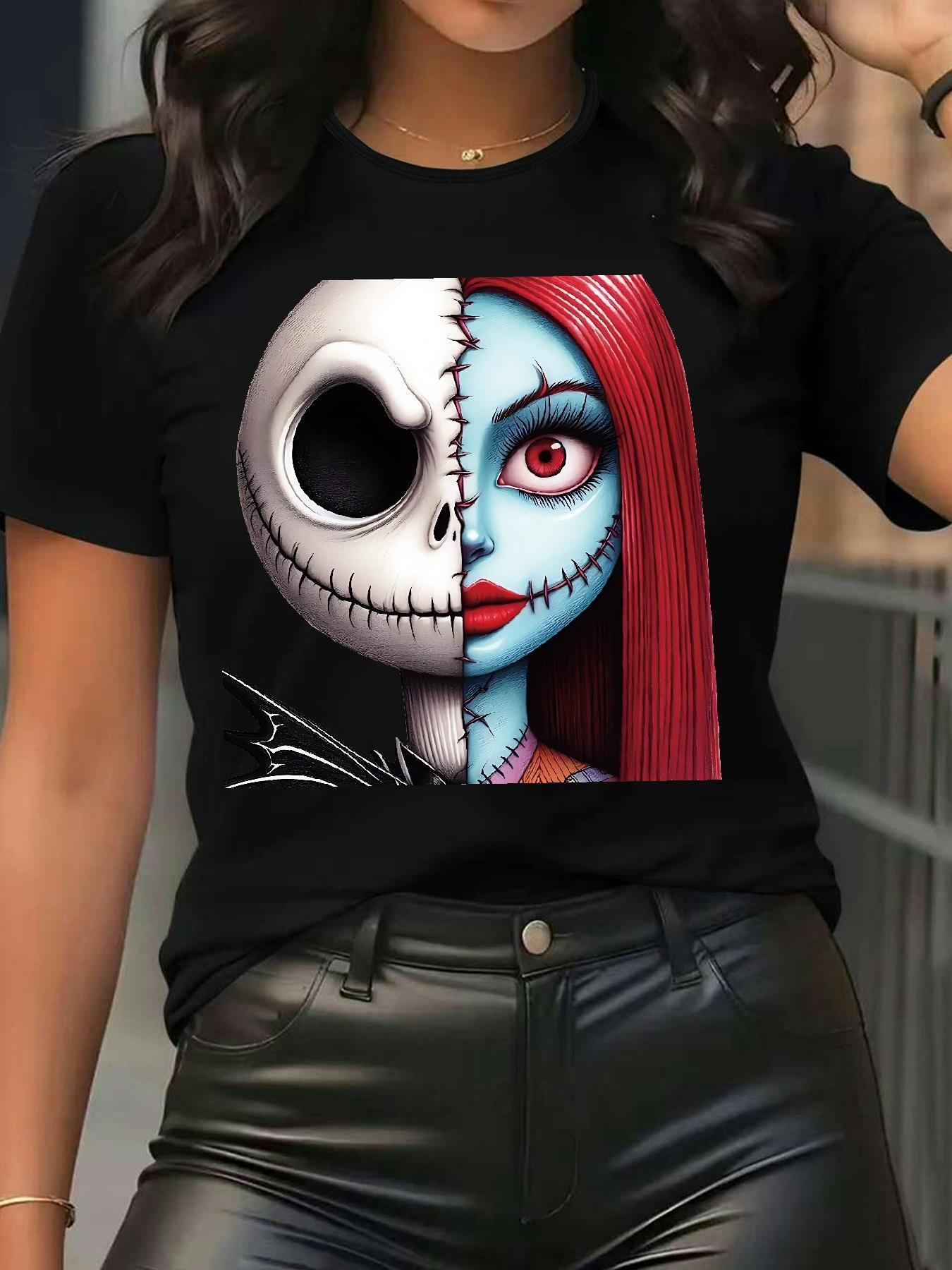 Women'S Casual Graphic T-Shirt - Black Short Sleeve Round Neck Tee with Jack Skellington & Sally Design, Stretchy Polyester Blend, Perfect for Spring/Summer/Fall, Casual Wear | Playful Design | Stretchy Fabric